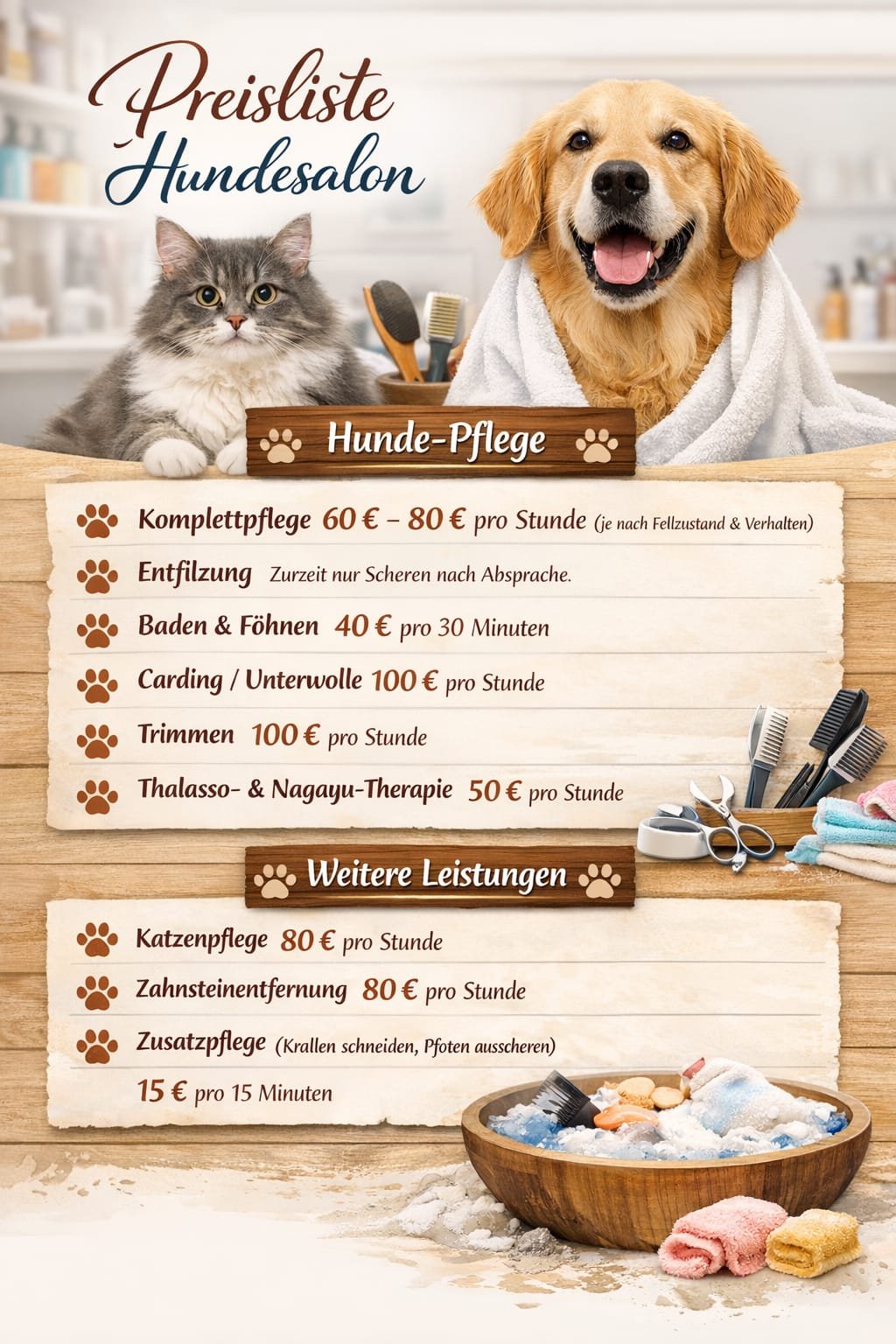 Die angegebenen Preise dienen als Orientierung und können je nach Größe, Fellzustand, Pflegeaufwand und Verhalten Ihres Hundes variieren. Bei stark verfilztem Fell oder zusätzlichem Mehraufwand können Aufpreise entstehen.
